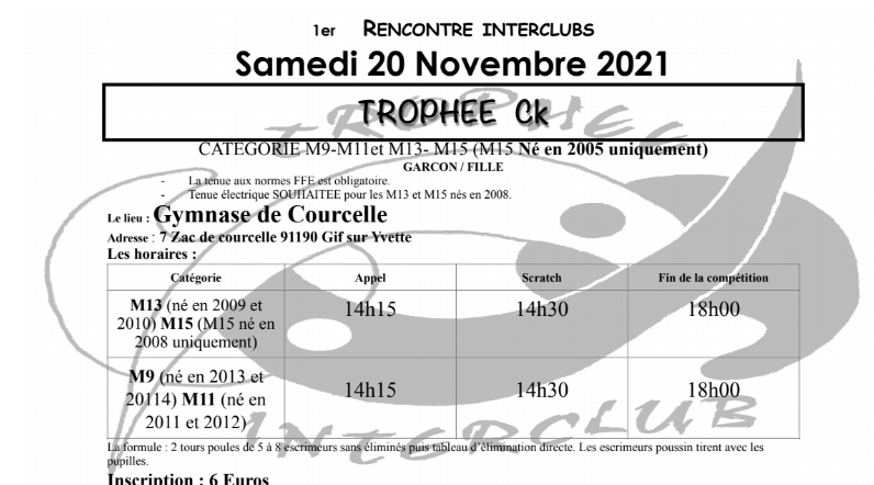 Après une première étape à Gif-sur-Yvette avec le trophée CK, la seconde compétition du circuit interclubs de sabre va se tenir aux Ulis le samedi 28 janvier à partir de 14h. Toutes les informations pratiques sont données ci-dessous :