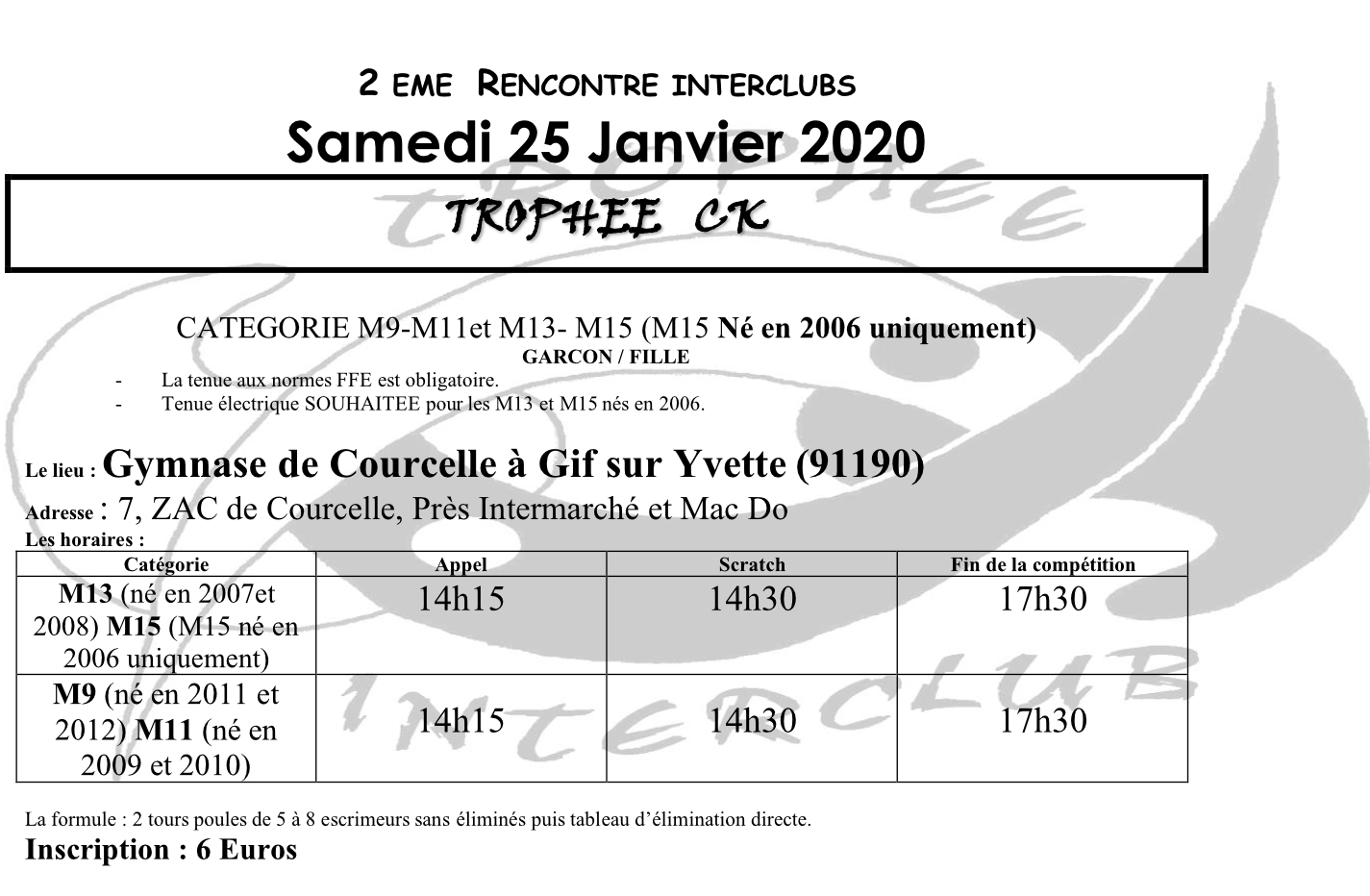 La seconde rencontre interclubs va se dérouler le samedi 25 janvier au gymnase de Courcelle à Gif sur Yvette à partir de 14h15.